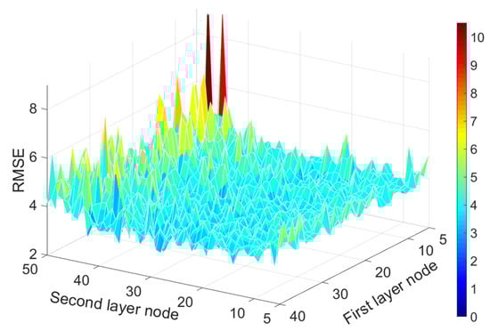 Compared with ELM, VTELM increases the depth of the network. Therefore, VTELM needs to set the number of the two hidden layer nodes because the parameters between the two hidden layers are randomly generated. If the number of nodes does not match the scale of the model, it will cause a decrease in VTELM accuracy. Therefore, in this paper, the number of hidden layer nodes in VTELM is tested to determine the optimal number of nodes, using RMSE as the evaluation index. In order to expand the search range, the first layer nodes (L1) are set to 5 to 40, and the second layer nodes (L2) are set to 5 to 50 in this paper. After simulation experiments, the variation law of VTELM accuracy with the change of the number of nodes is obtained.