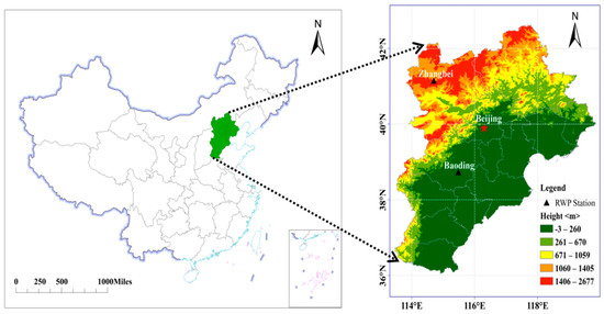 The North China Plain is one of the main economic zones in China, in which rapid urbanization and high atmospheric pollutant emissions have been seen in recent years. Although Solanki et al. [3] has revealed the fine PBL structure in Beijing by retrieving ε using a one-year record of RWP measurements, the PBL structures on the regional scale remain unclear. As shown in Figure 1, two RWP stations at Baoding (plain area) and Zhangbei (plateau area), part of the RWP network of China [35], provide us another unique opportunity to check the variation of PBL structure over different terrain. Therefore, the objectives of this study were twofold: (1) what is the difference in turbulent dissipation rate profile between plain and plateau areas, and (2) what are the influential factors and relevant underlying mechanisms. The following parts of this paper will proceed as follows: The RWP measurements and analysis methods are described in Section 2. In Section 3, observational analysis will be conducted on the turbulence dissipation rate difference between the Baoding and Zhangbei stations, and the potential influential factors and mechanisms are also discussed. Finally, the main conclusions are given in Section 4.