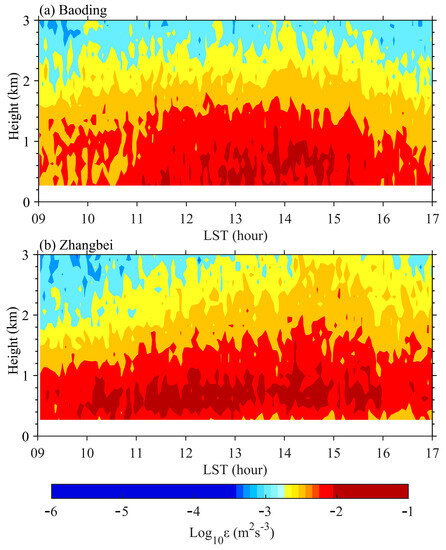 The ε exhibits significant dependence on height during the daytime over the two stations. A pronounced spatial gradient can be observed, decreasing gradually from the ground surface up to 3 km AGL. Most of the ε values within the 3 km at Baoding varied from to , which are consistent with those reported for the similar lower tropospheric region in other cities [3,39]. By comparison, a much stronger ε was observed at Zhangbei, most of which varied from to on average within 1 km AGL. This phenomenon begins at 1000 LST and lasts until 1600 LST. This suggests that the turbulent activity in the PBL at the plateau station is obviously stronger than that in the plain station. More intense turbulence found in the PBL over the plateau station could be likely due to the mountain wave breaking over complex terrain at Zhangbei [42,43,44,45].