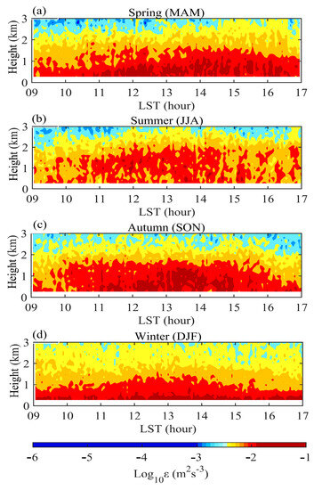 Figure 3 shows that the diurnal variation of the ε profile within 3 km AGL at Baoding in the daytime under clear-sky conditions for the four seasons. Overall, the PBL in boreal summer reached much higher compared with that in boreal winter, given the strong turbulence (greater than ) observed at a height as high as 1 km in summer. Intense turbulence can be seen in the late afternoon (1500 LST–1700 LST) of summer in the altitude range between 1 and 2 km, which cannot be seen in other seasons at the same station of Baoding.