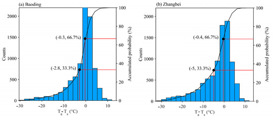 Probability distribution (blue bar) and accumulated probability distribution (solid line) of the difference between 2 m air temperature and surface temperature (Ta−Ts) at Baoding (a) and Zhangbei (b).