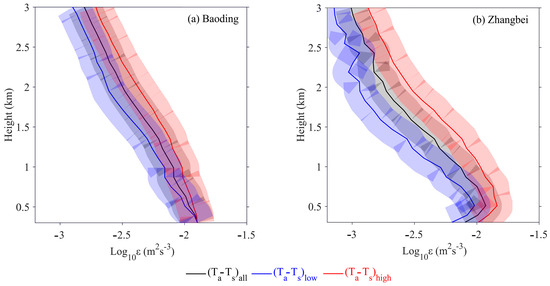 Vertical distribution of the annual mean turbulent dissipation rate stratified by the difference between 2 m air temperature and surface temperature (Ta−Ts) during the daytime for the year 2021 at Baoding (a) and Zhangbei (b). All the samples are divided into three same-size bins. Note that the turbulent dissipation rate profiles for the top tercile, i.e., (Ta−Ts)high, and bottom tercile, i.e., (Ta−Ts)low, along with all samples, i.e., (Ta−Ts)all are shown. Also marked is one standard deviation.