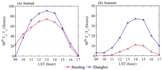 Temporal variation of the 90th percentile of the difference between 2 m air temperature and surface temperature (Ta−Ts) during daytime from 0900 LST to 1700 LST at Baoding (red solid line) and Zhangbei (blue solid line).