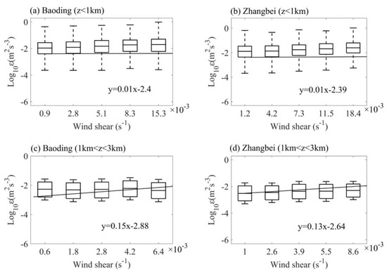 Turbulent dissipation rate (ε) at the height range lower than 1 km (a,b) and the height range between 1 km and 3 km (c,d) as a function of vertical wind shear at Baoding (a,c) and Zhangbei (b,d). All samples are evenly divided into five same-size bins, and the regression linear equation is shown in each panel as well.