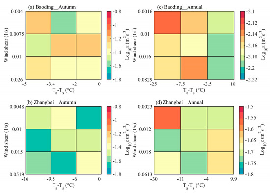 Joint dependence of (a,b) autumn mean turbulent dissipation rate (ε) and (c,d) annual mean ε in the PBL at (a,b) Baoding and (c,d) Zhangbei on vertical wind shear and the difference between 2 m air temperature and surface temperature (Ta−Ts).