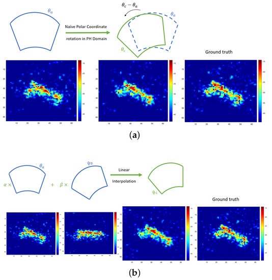 This section describes the pose synthesis methodology used for data augmentation when using the PH model. This work builds on our earlier work, which focused on modeling of the scattering behavior of targets in monostatic and bistatic setups [33,62,63,64,65,66,67,68]. We first constructed a model for each image in the training data set and locally extrapolated the measured images through using the model. We assumed that a SAR sensor that operated in the spotlight mode was used to create the images (as in the case of the MSTAR data set). The images were translated from the spatial domain to the Cartesian frequency domain via the steps described in [69]. Subsequently, we converted the frequency measurements to the polar coordinates to obtain the phase history measurements described in [70].