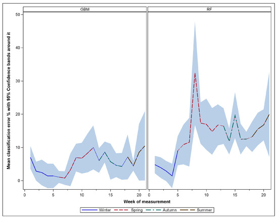 Regarding the results of GBM, the classification inaccuracies were generally lower (average classification error of 5.6%) than those of the random forest model. At a detailed level, the average error classification at each of the measurement times ranged from a minimum average error of about 0.8% observed from the beginning of the spring season to the largest classification error of about 10.5% observed from measurements gathered in autumn. However, the temporal pattern of the GBM classification errors was not as variable as that of the RF errors since larger error fluctuations were more pronounced in the random forest models.
