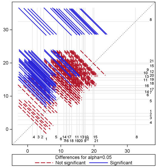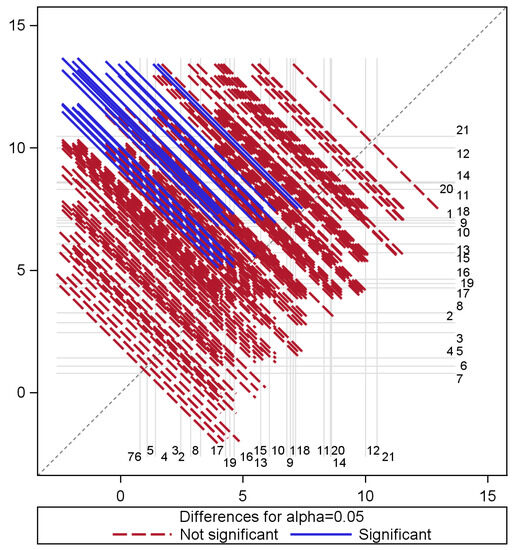 A statistical analysis was conducted in which a generalised linear model was used to determine whether the average classification error for the measurement time varied significantly. To determine whether there were significant changes in the mean error, specifically over time, we used the least squares difference (LSD) at an alpha () level of . The model suggested that at least one of the time points is statistically different with respect to classification errors obtained from the random forest model and that the measurement time accounts for approximately 46% of the variation in these errors. A multiple comparison of the effect of time on classification errors is shown in Figure 3, with distinct pairs of time shown by blue diagonal lines, while those that are not statistically different are indicated by red diagonal lines. In this figure, the mean classification error for time is shown along the x-axis, with the mean error of the other time along the y-axis with a dot at the intersection. The identity line represents the equality of means such that if a vector does not cross this line, we can conclude that the means’ mean errors are significantly different between relevant time periods. Otherwise, the means are similar if the lines cross the identity line. Red vectors are used to identify significant differences between time periods, whereas blue lines indicate time vectors with similar classification errors with respect to their average errors. It is most noticeable in Figure 3 that most error differences occurred between Time 8 (with the largest mean error of about 32% and representing a measurement period in September) and the rest of the other measurement periods. Other pairs of time where distinct differences occur mostly include time pairs that are farther apart. For example, the earlier time periods that included measurements gathered between June and July consistently differ (in terms of average classification inaccuracies) from the later measurements taken in January and May of the following year. Regarding understanding the variation of errors from the boosted model, the analysis indicates that measurement time has an effect on the variation of classification errors and accounts for nearly 21% of these differences. Generally, differences in the temporal pattern of these errors are not as pronounced as differences obtained from the random forest model.