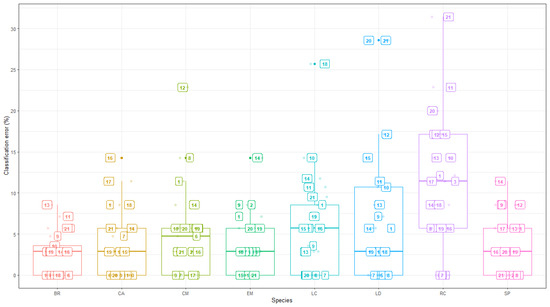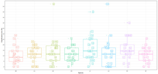 The smallest classification inaccuracies occurred in the June to August measurements for all tree species. The pattern of inaccuracies observed at a species level corresponds to the generic patterns discussed above. However, additional information suggested that even though the highest average classification error came from the random forest model, species-level classification errors were subject to larger variations in classification rates. The influence of these larger errors, with seemingly outlier properties, had an influence on the average errors in Figure 2, particularly for Time 8, which stands out as having the largest inaccuracies.