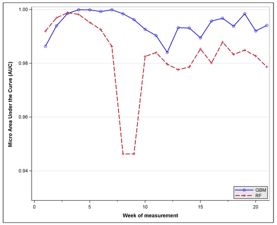 Figure 7 compares the classifiers’ performance based on the micro AUC, demonstrating that both models provided an adequate categorisation of the tree species, with GBM offering a slightly superior discriminatory ability than RF for a majority of the periods in question. The pattern of variability in accuracy through time appears to be consistent with the insights which have already been revealed in preceding results.