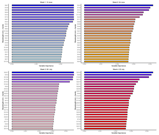 It is important to note that the application of the classification algorithms was re-adjusted to achieve the best results. Classical random forest models, for example, employ randomness to reduce the correlation among trees, but this can lead to feature selection bias because variables with more potential splits may be favored. For this reason, a more robust method was used to reduce bias in the selection of the spectral signatures with better predictive contribution, especially in the random forest. A conditional inference-based approach [22] was used in this study to minimise the bias in the selection of important features while evaluating the significance of the correlations between the predictors and the response variable (category).