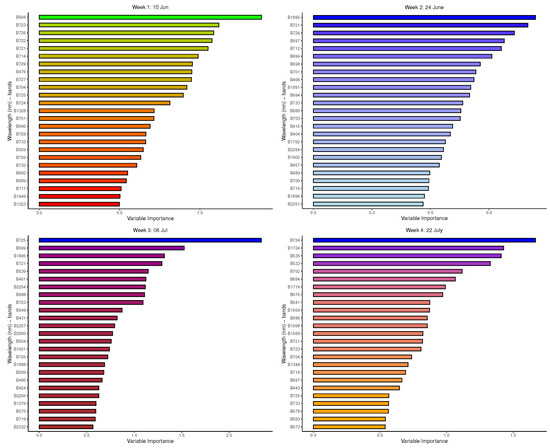 Figure 9 depicts the bands identified as the most important by the GBM model in relevant winter weeks. Regarding Time 1, GBM mostly selected the signatures from the NIR range of the EMS, especially those in the red-edge region, and very few SWIR signatures, as the most important bands in discriminating between species. For Time 2, the strongest signatures identified by GBM were predominantly those from the VIS (with mainly blue, a few red, and green bands), NIR and the SWIR regions. Time 3 had a number of SWIR bands, a mix of red, blue, and green bands from VIS, and only one NIR signature, just as in the previous two time points. The important bands in separating species from Time 4 include those from SWIR, VIS (with no yellow bands included), and a few NIR bands.
