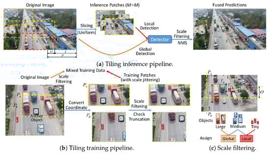 As shown in Figure 2a, to avoid the truncation of tiny objects, when setting the tiling patch size and number, we make adjacent sub-patches have overlaps with each other. Concurrently, to keep the performance of larger objects, we introduce global detection on the original input image. Furthermore, as the spatial sizes of the images in datasets are unfixed and we hope to simultaneously perform local and global detection employing just a single model instead of two independent models, the aspect ratio of the patches should be the same as the original image. Therefore, we choose to make patches have a fixed relative scale ratio with the original image (equal for both width and height), instead of setting fixed and absolute side lengths.