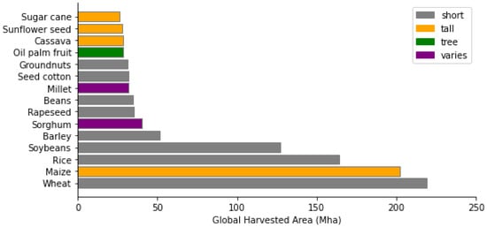 Most commonly grown crops in the world based on FAO crop statistics for 2019, color coded by crop heights base on U.S. National Plan Germplasm System. Crops are considered tall if most common varieties exceed 2 m in peak height. Data source: http://www.fao.org/faostat (accessed on 1 February 2023) for global crop areas, https://npgsweb.ars-grin.gov (accessed on 1 February 2023) for crop heights.
