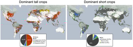 Maps illustrating dominant crops based on IFPRI SPAM-2010 v2.0 [] (using the layer corresponding to physical area—all technologies together). In these maps, a crop is deemed dominant in a region if it accounts for more than 90% of the tall or short crop total area. The map on the left displays tall crops (i.e., maize, sugarcane, sunflower, and cassava), with maize dominating in 48% of areas with tall crops. Put another way, 68% of the total global area where maize is grown consists of regions where maize is the dominant crop; for sugarcane, this fraction is 46%. The map on the right represents short crops. It includes all the short crops listed in the SPAM dataset (with the exception of wheat, barley, and rapeseed grown primarily during winter). A total of 50% of the global area where soybean is grown consists of regions where soybean is the dominant crop, while for rice this fraction is around 20%.