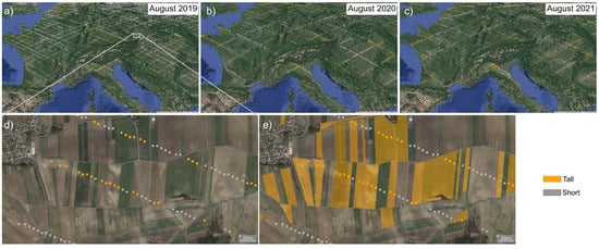 Spatial locations of GEDI shots over croplands in Europe. (a–c) Show spatial distribution for 2019–2021, respectively. Starting in 2020 higher International Space Station (ISS) altitudes caused the clustering of GEDI observations along its orbital track (i.e., “resonance”) leaving bigger gaps across tracks. (d) Zoom in of GEDI shots for 2019 over fields in Austria, color coded by GEDI model predicted class, gray for short, orange for tall crop. (e) Same as (d) but also showing the fields growing maize according to ground truth from Austria parcels dataset, illustrating that GEDI predicted class agrees well with the ground truth.