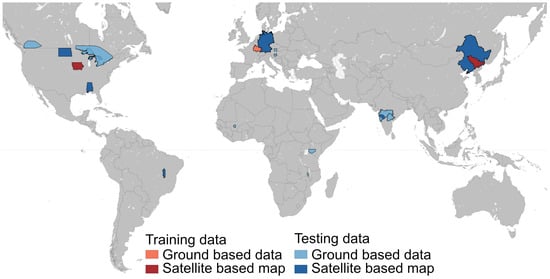 Distribution of data used for training the GEDI model in red, and independent evaluation of the final maps in blue. Ground-based refers to either point or polygon data collected on the ground. Satellite-based refers to maps typically created by combining ground data with remote sensing datasets, such as the Cropland Data Layer in the United States.