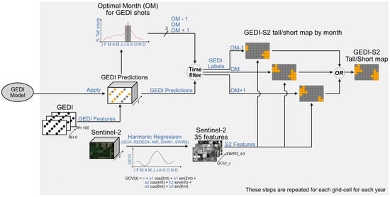 Flowchart of the steps for creating the GEDI-S2 tall/short map for each grid-cell in each year. The GEDI model is trained a single time using the GEDI RH metrics and corresponding crop type maps in three training regions (see Section 3.1). The steps in the gray box are repeated for each grid cell. To create the global map for a specific year, all the individual grid cell maps are mosaicked.