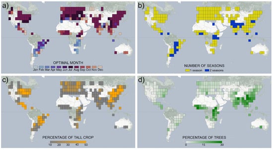 Characteristics of 5° 5° grid cells where GEDI-S2 was applied. (a) The optimal month to identify tall crops, defined as the month with the greatest proportion of shots classified as tall, (b) the number of growing seasons per year based on the Anomaly hotspots of Agricultural Production (ASAP) phenology information dataset [], (c) the percentage of shots classified as tall, and (d) the percentage of shots within the cropland classified as trees.