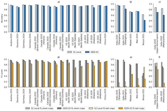 Comparison of GEDI-S2 model performance in terms of accuracy (a–c) and F1 scores (d–f) with the S2-Local model (i.e., a Sentinel 2 model trained on the local reference labels). In most regions, the performance of GEDI-S2 was very close to and occasionally even exceeded that of the S2-Local model (a,d). In some areas, both approaches struggled with tall crops (b,e), while in others GEDI-S2 performed worse than the S2-Local model (c,f).