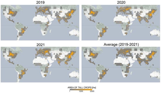 The overall pattern of tall crop area estimated by our model is shown for each year in Figure 10. In general, this map corresponds to known areas of maize production, as expected because maize is the most widespread tall crop in the world (Figure 1). However, it also indicates areas with significant sugarcane area (e.g., western Uttar Pradesh in India, the eastern coast of South Africa, and the Philippines) as well as sunflower area (e.g., Romania and Ukraine).