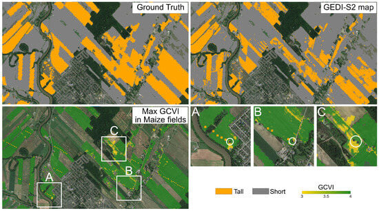 An example of GEDI-S2 errors in low biomass maize fields in Canada. Ground truth (top left) represents the Canada AAFC 2019 map. The corresponding GEDI-S2 2019 predictions (top right) miss several tall fields. S2 peak GCVI in the 2019 growing season (bottom left) indicates that omitted fields often have a peak GCVI below 4 (yellow to light green). A zoom into three examples (panels A, B and C) (lower right) shows the individual GEDI shots and the predicted class (orange = tall, gray = short). Circles indicate examples where the shots were classified as short over low GCVI areas. Since the GEDI-S2 model is then trained on the predicted classes for these shots, it also incorrectly classifies some tall crop area as short.