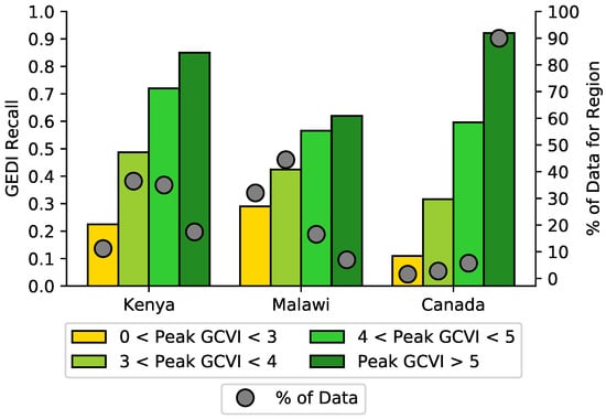 To further explore the hypothesis that GEDI struggles are related to low biomass of the tall crop, we consider three regions for which maize spans a range of low to high biomass—Kenya, Malawi, and Canada. For each region, we take all GEDI shots that fall onto pixels predicted to be maize by either the local reference data (in the case of Kenya and Canada) or the S2-Local model (in the case of Malawi), and then split these GEDI shots into four groups based on the peak GCVI of the S2 pixel that overlaps the GEDI shot. Peak GCVI is used as a proxy for biomass, given that GCVI has been widely shown to correlate well with maize biomass []. We then calculate the fraction of maize GEDI shots predicted to be a tall crop. Consistent with our hypothesis, we find that the GEDI recall is much higher for fields with higher peak GCVI (Figure 12). Recall increases monotonically as the GCVI increases, and recall for pixels with a peak above 4 is at least double that for pixels with a peak VI below 3. Based on this analysis, we consider pixels with peak GCVI below 4 to be less reliable for GEDI-S2 predictions, and therefore provide a quality flag for these pixels in our final estimates.