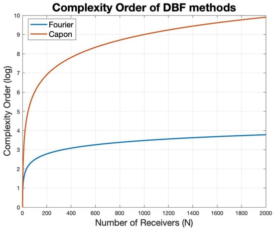 The Fourier method involves only matrix multiplication, namely , where k and D have a size of and , and each term represents beam steering direction and the geometry of receivers in the Cartesian coordinate system. This multiplication is repeated for every receiver (N). The complexity order of matrix multiplication of a matrix and a matrix, which produces a matrix, will be []. Therefore, the complexity order of the Fourier method is , which increases linearly with the number of receivers N. The Capon method involves the matrix inversion to calculate . The complexity order of the matrix inversion obtained by Gauss–Jordan elimination with a matrix will be []. Therefore, the complexity order of the Capon method will be , which increases exponentially with N. Figure 1 shows the order of complexity in the logarithm scale as a function of the number of receivers for each DBF method. Specifically, at the size of Horus (1024), the complexity order of the Capon method and the Fourier method are 9.03 and 3.487 in the logarithm scale.
