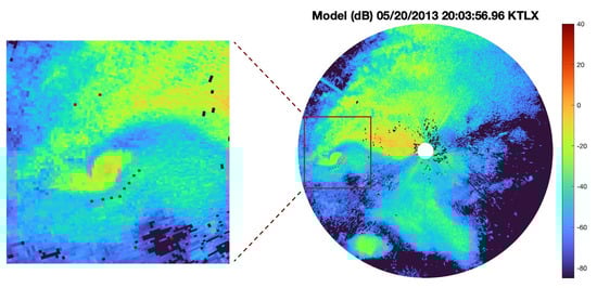 The simulation of weather-like time-series IQ signals, , using pre-existing meteorological variables, has been previously developed [,]. Note that and J represents the total number of time-series IQ signal realization from NEXRAD (i.e., the total number of simulated range gates). In this paper, archived NEXRAD data are read and processed by Python ARM Radar Toolkit (Py-ART), which is an open-source library for working with weather radar data []. Due to intrinsic radar characteristics and signal processing, it requires data conditioning for overlaid echoes in Doppler variables (labeled −888) and censored data (labeled −999) prior to the simulation. The overlaid echoes in Doppler variables are mitigated with a built-in function for de-aliasing velocity in Py-Art. Then, censored data are filled in with simulated noise.