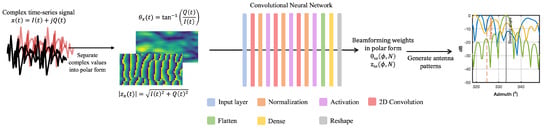 The proposed ABCNN is built to perform fast adaptive digital beamforming and improve the efficiency and quality of training. ABCNN is a feed-forward deep neural network built on a Python platform using the Keras library. Keras offers many different open-source layers and functions to optimize the flexibility and feasibility of designing neural networks for different purposes. To use the advantages of Keras, all the data should be a real value, since it does not support complex-valued data at the moment. Therefore, complex values of time-series signals and beamforming weights that are used for training and testing are transformed into a phasor form (i.e., amplitude and phase) to avoid the loss of phase information caused when separating complex values into real and imaginary parts. Preservation of phase information of the IQ time-series signals and beamforming weights is critical for the neural network to be properly trained. Therefore, the network learns the amplitude and phase information independently and in parallel with different activation functions to increase learning efficiency. The proposed network consists of a mix of convolution layers, batch normalization layers, activation layers, a flatten layer, a dense layer, and a reshape layer. An overview of ABCNN is shown in Figure 3. This network is designed to take time-series IQ signals as inputs and produce beamforming weights for each receiver (N) at specific angular directions () as output. It should be emphasized once more that the main contribution of this work is to mitigate the computational burden of the adaptive DBF method with an application of AI, and further studies on the performance of neural networks can be performed in the future.