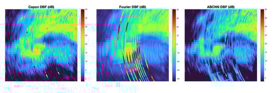 The PPI plot of signal power (dB) for the Capon (left), the Fourier (middle), and ABCNN (right) methods is shown. Note that all signal power fields are normalized to have a peak at 40 dB. The PPI plot for the Fourier DBF has a color scale from −42 dB to 40 dB and the Capon and ABCNN have a color scale from −2 dB to 40 dB.
