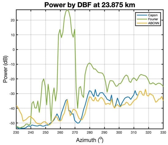 Second, the power of each DBF method at 23.875 km (range) from 230 to 330 is plotted in Figure 6 to evaluate DBF performance in detail. Note that all power plots are normalized to their minimum value for ease of comparison, since they all have different peak values and different dynamic ranges. The wind turbine is located at 264.23. The Fourier DBF shows high power returns coming back from 255 to 270, which is caused by sidelobe contamination from the WTC. On the other hand, the Capon and the ABCNN DBFs minimize overall power by suppressing the high power return from the undesired directions. Furthermore, note that the overall trends of the Capon and ABCNN are well-matched. This also shows that ABCNN successfully mimics the behavior of the Capon method.