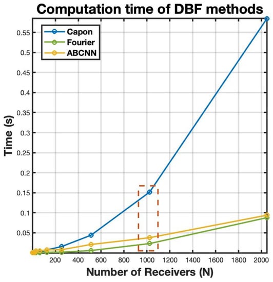 Lastly, the computation time of ABCNN is evaluated. The time to perform DBF for one range gate with six receive beams formed within one transmit beam by each method is measured as a function of the number of receivers, and is illustrated in Figure 8. The simulation of the Capon and Fourier DBFs had been performed in Matlab with an Apple M1 chip processor, and ABCNN was performed in Python with a 2.4 GHz Quad-Core Intel Core i5. The Capon method (blue) shows an exponential growth as the number of receivers increases, while the Fourier (green) and ABCNN (yellow) show a linear growth with the number of receivers. The computation time of ABCNN shows a similar trend and values with the Fourier method. Specifically, ABCNN takes about 0.047 s, and the Capon method takes about 0.15 s to compute beamforming weights of the six receive beams within a transmit beam for one range gate at the size of Horus (). This shows that ABCNN lowers computation time by a factor of three compared to the Capon method for one range gate calculation. It can be assumed that the computation of the Capon method will increase exponentially with the number of range gates, while the computation time of ABCNN will increase linearly. Furthermore, the speed of ABCNN can be improved with a faster computer processor. Note that the M1 chip processor is faster than the Intel Core i5 processor in general.