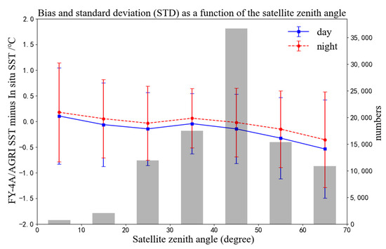 4.2. Relationship between SST Accuracy and Satellite Zenith Angle
