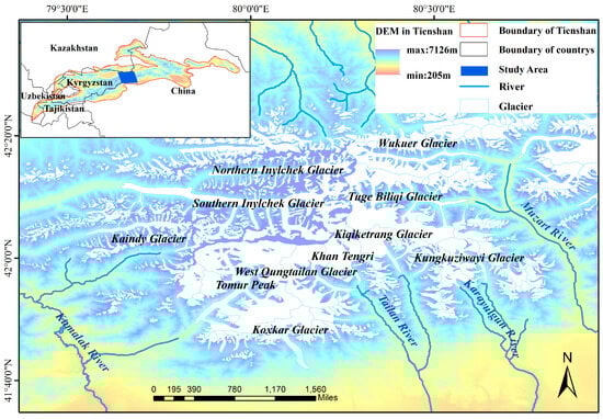 The TSMs are located in Eurasia (37°N–46°N, 66°E–95°E), with a length of about 2500 km from east to west and an average width from north to south of 250 to 350 km. The total area of the TSMs is approximately 135.5 × 104 km2 []. The TSMs are divided into the Western Tianshan, Eastern Tianshan, Northern Tianshan, and Tomur Peak Region according to the geographical location and spatial distribution. The study area of this research is located in the Temur-Khan Tengri Tomur Range, which is located in the central part of the TSMs (Figure 1). It represents the largest and most glacier-rich area in the TSMs, with a significant number of glaciers. Furthermore, there are over 40 peaks with elevations exceeding 6000 m in this area []. The study area includes Tomur Peak, the highest peak of the Tianshan Mountains, with an elevation of 7443.8 m and a total glacier area of approximately 3849.5 km2, located in the Kumalak River Basin []. In the study area, the glacier ablation period occurs from May to September, while the glacier accumulation period takes place from October to April in any given year. Influenced by the prevailing westerlies, approximately 70% of the annual precipitation is concentrated in summer [,]. Snowfall, as a form of precipitation in high-altitude regions, serves as the primary source for glacier development in the Temur-Khan Tengri Range. In the Tomur Peak Region, glaciers contribute to the main tributaries of the Tarim River, Ili River, and Syr Darya River in the form of glacial meltwater. During the dry summer season, this glacial meltwater provides a significant portion of freshwater supply to the areas near the rivers [].