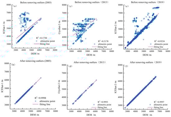 ICESat-1/2 and CryoSat-2 data before and after denoising were fitted with DEM for comparison, and Figure 2 shows some of the comparison results. Most data were fitted well in the fitting process, but several laser points were still affected by cloud cover, altitude, and slope, resulting in higher fitted elevations [].