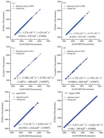 We thus developed a polynomial fitting function model to improve the spatial and temporal consistency of the footprints of ICESat-1/2 and CryoSat-2, with the selected datum DEM as the independent variable and the elevation of altimetry data as the dependent variable. Subsequently, we established the functional relationship between the satellite elevation and DEM elevation in interannual/seasonal time series, then calculated the correlation coefficient ():