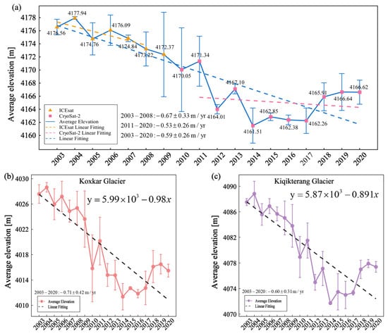 Time series of the average variations in glacier surface elevation in the Tomur Peak Region from 2003–2020. (a) is the average elevation variation in the Tomur Peak Region; (b) is the average elevation variations in the Koxkar Glacier; (c) is average elevation variations in the Kiqikterang Glacier.