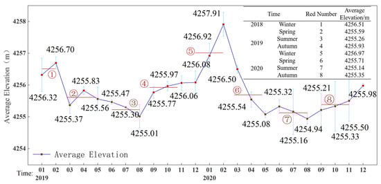 Monthly average variation in glacier surface elevation in the Tomur Peak Region from January 2019 to December 2020. The red sequence marks indicate the location of the seasonal average elevation.