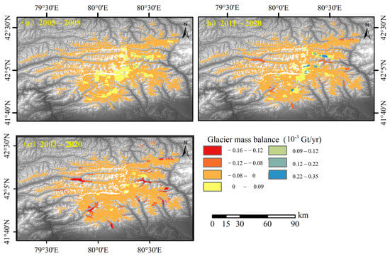 Glacier mass balance in the Tomur Peak Region during different study periods. The periods of (a–c) are 2003–2008, 2011–2020, 2003–2020, respectively.