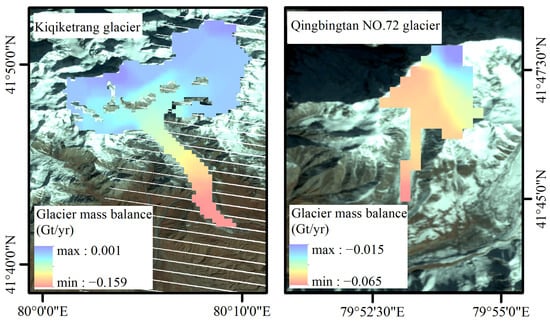 As shown in Figure 7, this paper studied the variability characteristics of some single glaciers. Both the Koxkar Glacier and the Qingbingtan No. 72 Glacier are to the south of Tomur Peak, with the Koxkar Glacier having an elevation of 3020–6342 m and an area of about 83.56 km2 [] and the Qingbingtan No. 72 Glacier having an elevation of 3560–5986 m, an area of 6.6 km2, and a length of 7.4 km []. The two glaciers have similar latitudes and longitudes, and they are theorized to have similar variations in mass balance, so the two glaciers were chosen to confirm each other. The mass balance of both glaciers showed a significant trend of variation. The mass loss of the glacier in the low elevation area at the end of the glacier tongue was more serious, and the loss gradually decreased with increasing elevation, shifting from negative GMB values to positive ones. The two glaciers selected in this paper differ greatly in scale, but obviously the glacier ablation decreased, and glacier accumulation even occurred in the high-altitude area, which indicated that high altitude has an obvious inhibitory effect on glacier ablation.