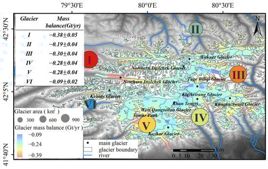 In this paper, we also divided the glaciers in the study area into six different sub-regions according to the distribution of terrain and river basins, and the GMB of each sub-region was provided in the figure (Figure 8). The highest rate of glacier mass loss was in region I, with a GMB of −0.38 ± 0.05 Gt/yr, followed by region III, with −0.30 ± 0.04 Gt/yr. The smallest variation in GMB was only −0.09 ± 0.02 Gt/yr in region VI.