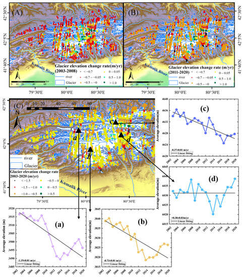 Elevation variation rates of altimetric points in the Tomur Peak Region during different periods. The periods of (A–C) are 2003–2008, 2011–2020, 2003–2020, respectively. Four points (a–d) in different elevation ranges were selected from all the altimetric points in the Tomur Peak Region.