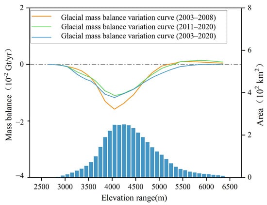As shown in Table 4, this study divided the study area into 100 m-interval elevation bands based on elevations and classified the glacier extent and glacier area of each elevation band with RGI 6.0. Based on this, GMB variations at different elevations in the Tomur Peak Region were calculated for different study periods. Yubin Fan [] estimated the mass balance of Asian alpine glaciers by using this method with ICESat-2 and NASADEM data from 2000–2021 and obtained better results. From 2003–2020, the mass balance variation rate for the whole study area was −1.51 ± 0.04 Gt/yr, where the average glacier mass loss rates from 2003–2008 and 2011–2020 were −1.42 ± 0.05 Gt/yr and −1.15 ± 0.04 Gt/yr, respectively. According to the relationship between GMB and glacier elevation (Figure 10), it was observed that the GMB variation gradually changed from negative to positive with increasing elevation. From 2003–2020, the mass balance variation rate for the whole study area was −1.51 ± 0.04 Gt/yr, where the average glacier mass loss rates from 2003–2008 and 2011–2020 were −1.42 ± 0.05 Gt/yr and −1.15 ± 0.04 Gt/yr, respectively.