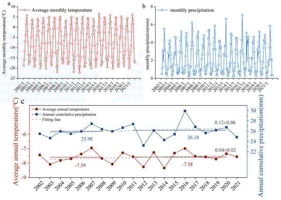 The analysis of climate change in glacier regions is essential for understanding the patterns of glacier variations, as climate serves as the primary driving factor for glacier changes. The increasing temperature will cause glacier ablation and decreasing glacier mass, and there is a negative correlation between temperature and GMB; precipitation is one of the factors of glacier accumulation, and there is a positive correlation between precipitation and GMB, which increases the glacier accumulation and contributes to increasing glacier mass [,]. The Tomur Peak Region has an average elevation above 4000 m, with low temperatures and relatively abundant precipitation on windward slopes under the influence of the prevailing westerlies in the TSMs. To investigate the response of the GMB to climate change in the Tomur Peak Region, this paper analyzed the temperature and precipitation changes by using ERA5 reanalysis data in the Tomur Peak Region and then analyzed the factors influencing the GMB variations.