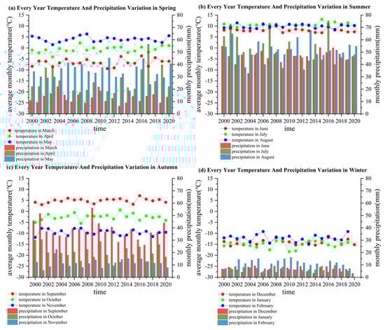 Furthermore, to analyze monthly variations in detail, we calculated trends over time by month for temperature and precipitation and presented them in Figure 12. In Figure 12b, it is evident that temperatures and precipitation are highest during the summer months each year. However, when combined with the data in Figure 5, it becomes apparent that higher precipitation does not necessarily impede glacier melting. This observation raises the possibility that summer precipitation might contribute to glacier warming, thereby diminishing the potential cooling effect of increased precipitation and potentially even accelerating the melting process. The study reveals similar ranges of temperature and precipitation in spring and autumn each year. As depicted in Figure 12a,c, the general trend shows an increase in temperature and precipitation during spring, while both temperature and precipitation decrease progressively during autumn. Based on the monthly variation trend of GSE, autumnal GSE gradually rises, while elevation variation remains unstable in spring, potentially featuring scenarios of initial elevation rise followed by a decline, continuous descent, or others. Taking into account Figure 5 and Figure 12, it is notable that the average temperature during spring 2019 was lower than that of spring 2020, accompanied by a brief elevation increase in spring 2019. This leads us to speculate that the impact of temperature is more significant in driving glacier variations. In Figure 12d, winter experiences low temperatures and precipitation, predominantly in the form of snowfall, which is conducive to glacier accumulation. However, due to minimal precipitation, glacier accumulation is limited in winter and is insufficient to counterbalance the rapid melt caused by substantial temperature increases. Overall, glacier mass growth can be observed more effectively only when temperatures consistently remain in the negative range.