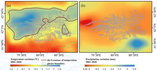 The response of different glaciers to temperature and precipitation varies depending on regional terrain, glacier area, elevation, and other factors [,,]. To analyze the main reasons for the spatial variation in GMB in the Tomur Peak Region in detail, this study provided a specific analysis of the autumn temperature and precipitation trend maps in the Tomur Peak Region from 2003–2020 (Figure 13). The temperature generally showed a distribution of south–high to north–low and west–low to east–high, with significant temperature increases in the south of Tomur and Koxkar, where the maximum rate of GSE variation (−1.65 ± 0.08 m/yr) in the study area occurred. The smallest temperature change was observed in the eastern and northwestern part of the study area, where there is more precipitation under the influence of the prevailing westerlies. The abundant precipitation compensates for the glacier mass loss, so the rate of GSE variation in this area is the smallest, at −0.4 ± 0.12 m/yr. As shown in Figure 13b, the precipitation generally showed a distribution of north–high to south–low and east–low to west–high. In a more detailed analysis, firstly, there was an overall decreasing trend of autumn precipitation but there was a significant positive change in precipitation in the northwest study area. Furthermore, the autumn rainfall was in an increasing state here from 2003–2020, and the rest of the area was in a negative state, especially in the southeast of the study area. From a comprehensive perspective, regions characterized by lower temperatures are associated with relatively higher levels of precipitation. Overall, the continuous ablation of GMB in the Tomur Peak Region during 2003–2020 was the result of the combined effect of temperature and precipitation. In addition, the obvious uneven distribution of temperature and precipitation due to the influence of the geographic environment of the study area has resulted in significant regional differences in GMB variations.