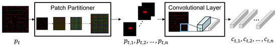 Specifically, the patch size is determined in the Swin Transformer+ model to ensure that the patch contains one dynamic object; therefore, the preprocessed image is divided by the Patch Partitioner into n number of fixed-size patches, denoted as . The convolutional layer encodes the raw RGB pixel values into token features , as shown in Figure 3. The process of the Patch Encoder is expressed in Equation (2):