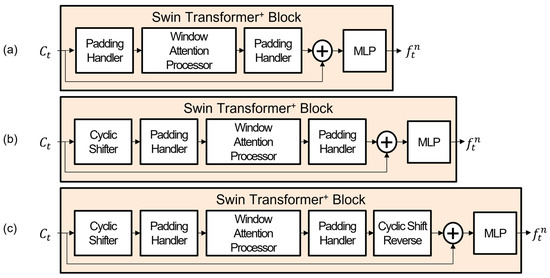 The configuration of Swin Transformer+ Blocks, in order from above (a–c): (a) first Swin Transformer+ Block in stage; (b) second Swin Transformer+ Block in stage; (c) last Swin Transformer+ Block in stage.