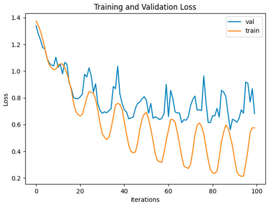 Figure 6 shows the training and validation losses of the proposed method. The training loss of the proposed method started at 1.24068, decreased to 0.41616, and then converged. This indicates that training for up to 92 epochs is necessary for convergence because the lowest loss was recorded at 0.00587. The figure also shows the change in validation loss. The initial validation loss of 1.24068 decreased to 0.68185. In the 89th epoch, the model achieved the lowest validation loss of 0.56141 for the validation dataset.
